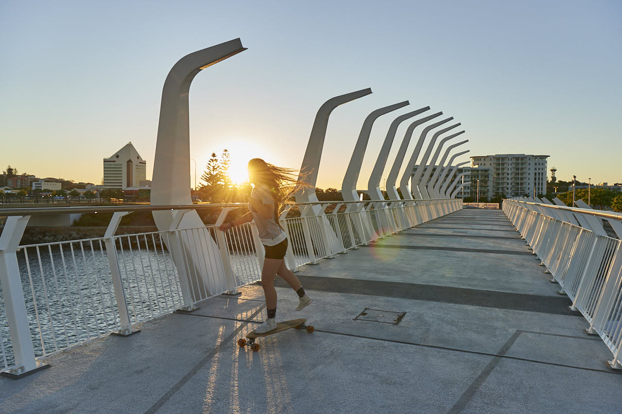 Koombana Footbridge Koombana Drive, Bunbury WA 6230 Koombana Bridge is an architecturally designed footbridge over The Plug in the Leschenault Inlet connecting Bunbury’s CBD and Marlston Water to Koombana Bay. The structure has been shaped to evoke the image of a ship’s hull, paying tribute to the shipwrecks that are buried under the shores of Koombana Bay. Designed by Gresley Abas Architects, the striking steel ribs are more than 7m tall. By night the bridge lights up to dramatic effect making for safe passage for pedestrians and cyclists. Contact Get Directions